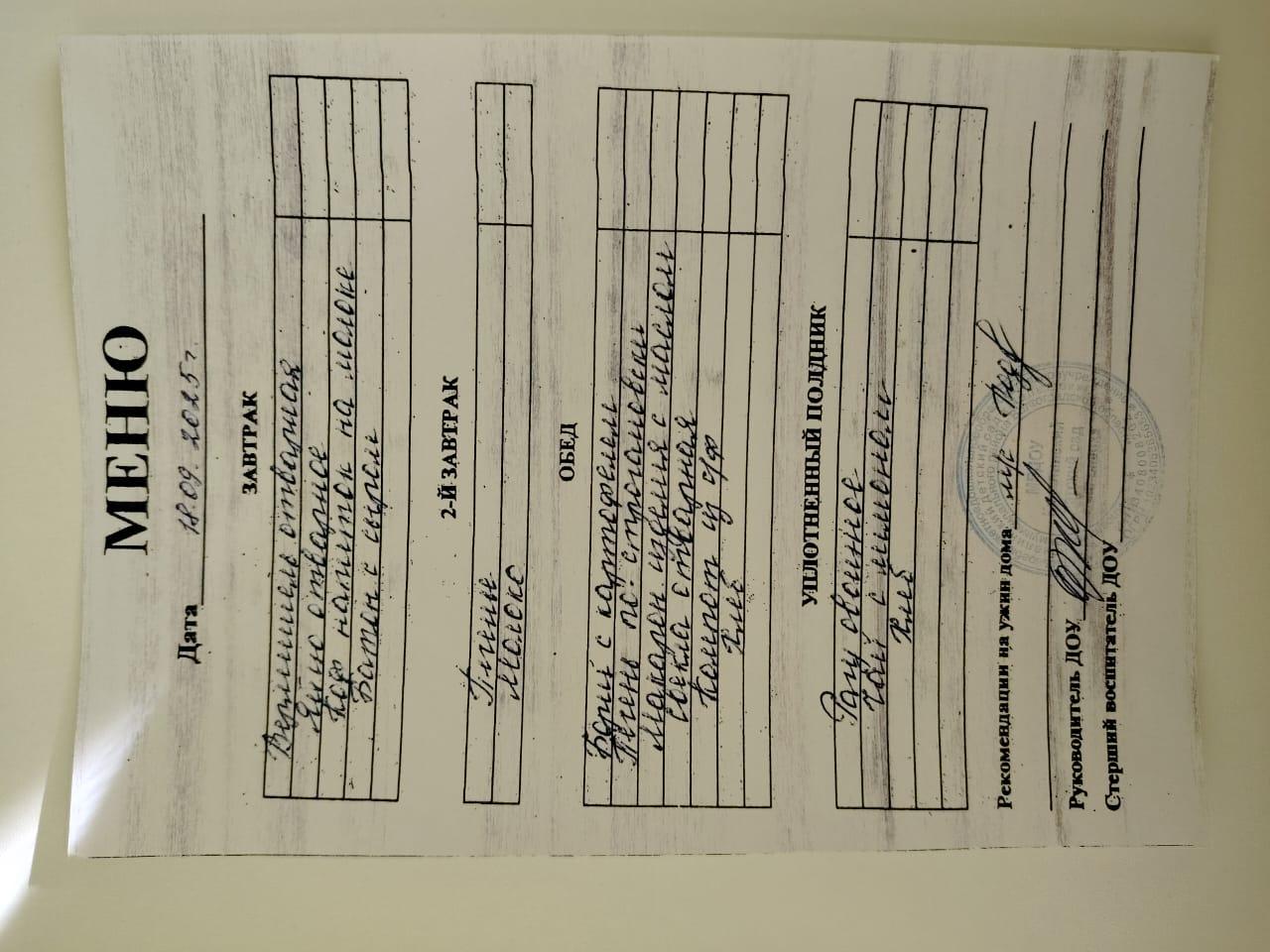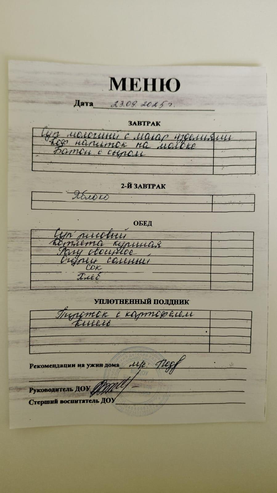 Строго соблюдается питьевой режим. Организация питания в детском саду находится под постоянным контролем администрации учреждения. Меню детского сада ежедневно размещается на стенде учреждения, так же ежедневно информация о питании воспитанников размещается в групповых информационных уголках для родителей.